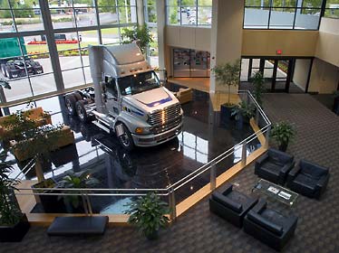 The new 5,000 sqft. aluminum-clad addition provides relief to the monotonous building behind. Inside the day-lit showroom is a full-size truck display, conference rooms, and a company store.